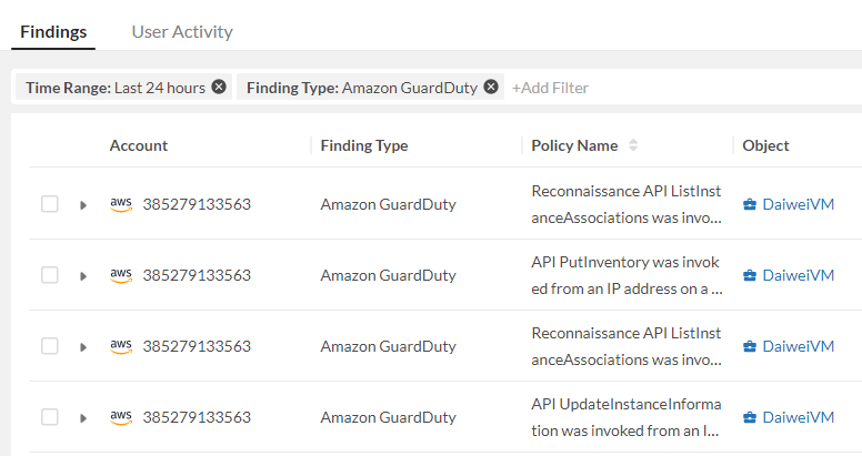 Amazon GuardDuty findings become part of threat insights and located in INSIGHTS > Threat > Findings tab.