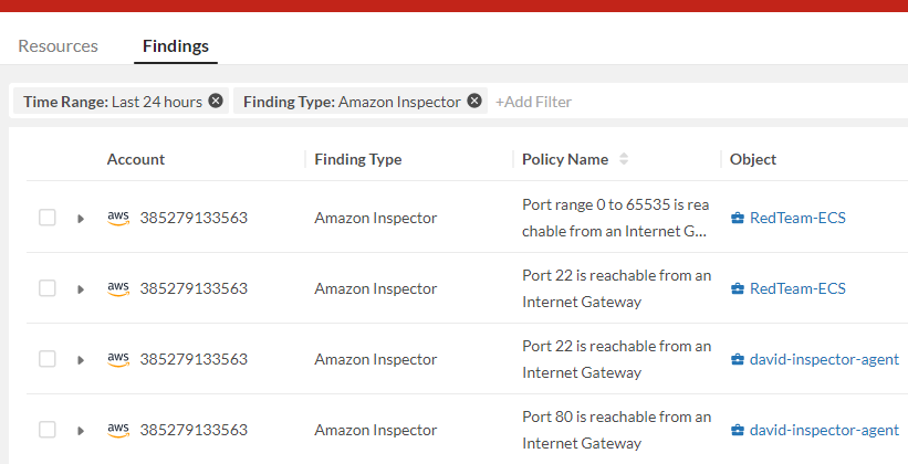 Amazon Inspector findings become part of risk insights and located in INSIGHTS > Risk > Findings tab.