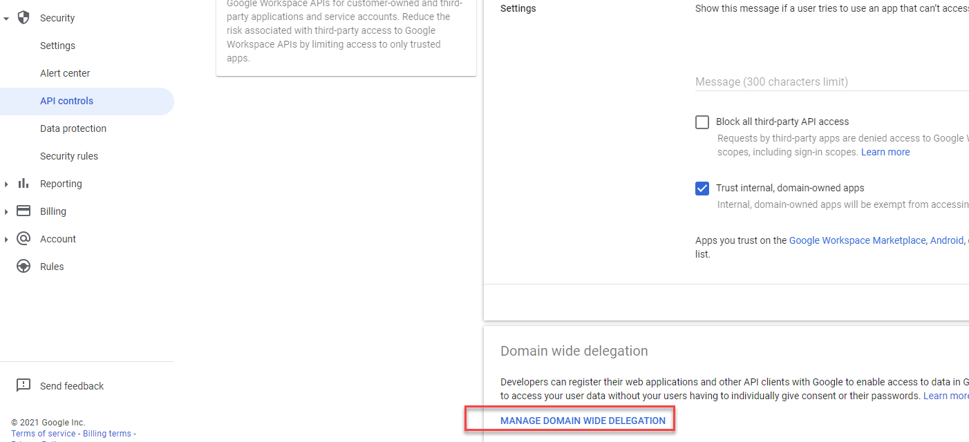 - Go to Security > API Controls, scroll down and click Manage Domain wide Delegation.