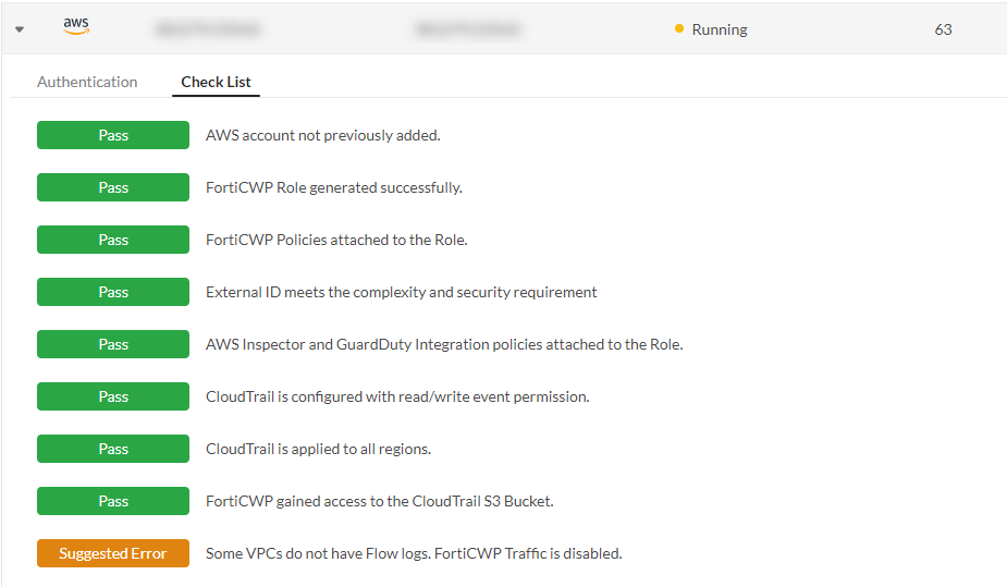 | Running | The cloud account is added successfully to FortiCNP and all account checklist items have Pass status. |