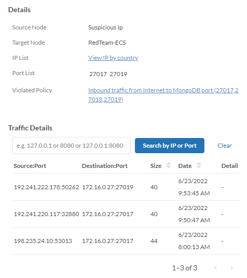 For example, clicking on the traffic coming from a suspicious IP will give a list of Violated Policies.