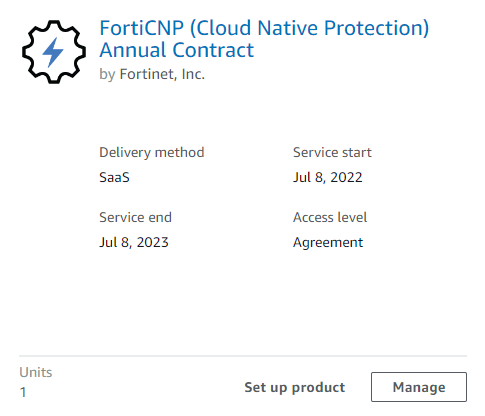 For Annual Contract license, to stop auto renewal, go to AWS Marketplace > Manage Subscription, click Manage in FortiCNP Annual Contract.