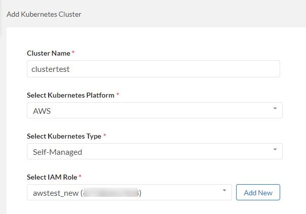- Click and select the IAM role associated with the Kubernetes cluster. If you have not already done so, click Add New to add the AWS IAM role to the Credential Store first.