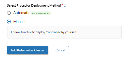 - Select Manual as the deployment method and click Add Kubernetes Cluster.