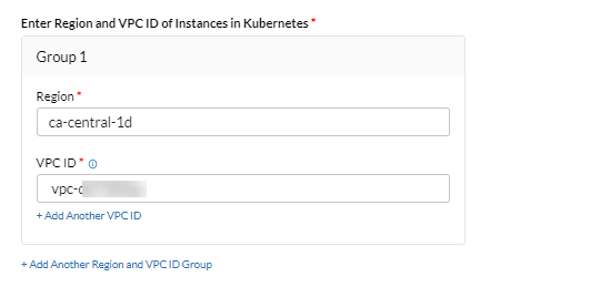 - Enter the region and the VPC ID instances in Kubernetes. If there are more than than one VPC, click +Add Another VPC ID to enter more VPC ID.