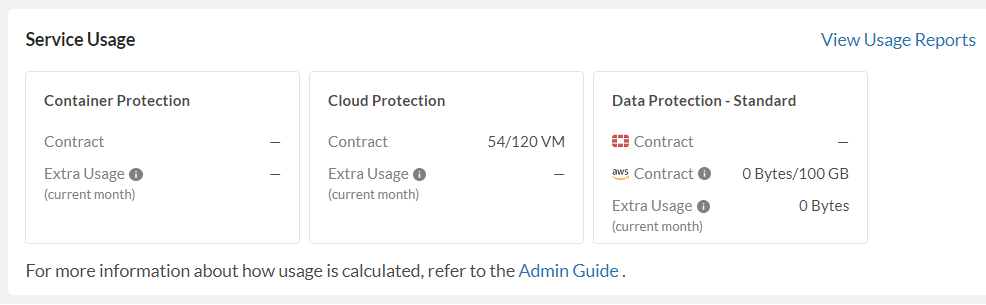For example, when Contract usage is at 100/100 and Extra Usage is at 25, means that 25 more VMs are being added to Cloud Protection for the current month. The Extra Usage always reflect the maximum number of extra VMs that are being added to Cloud Protection for the current month. The Extra Usage is then reset at the end of the month.