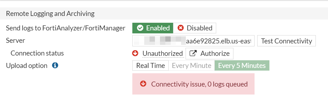 When clicked Test Connectivity in Log Settings, it may show "Unauthorized" status. This is due to the FortiGate device has not been added to FortiCNP yet. Please finish the onboarding process to add FortiGate device on FortiCNP, then come back to test the connectivity again.