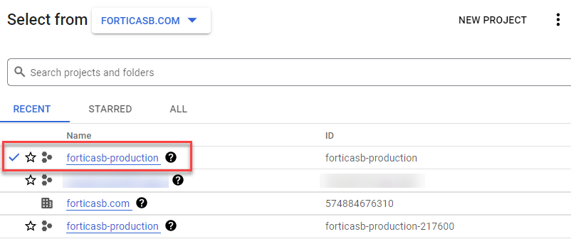 - Select the project that holds the FortiGate VM instance.