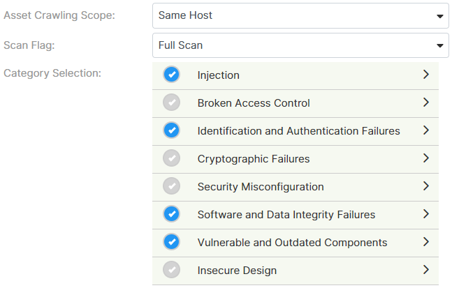 You can select/deselect OWASP Top 10 - 2021 categories of your choice to use for vulnerability assessment during scanning. For each of the selected OWASP 10 category, you can enable specific Fuzzer modules/sub-categories to fine tune the scan as per your network requirements.