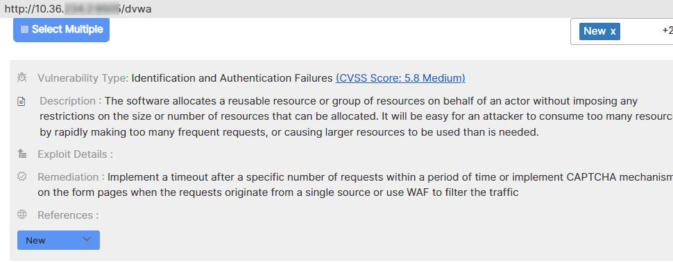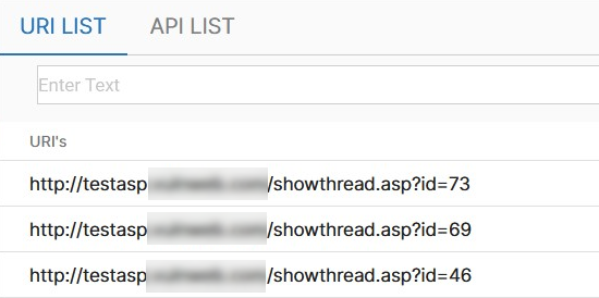 Clicking on the chart or on the displayed statistics brings up a list of URIs and APIs associated with the scanned asset. Click on any of the URI to view the all the detected vulnerability details, alternately, you can also filter the vulnerabilities data based on the severity by clicking on the severity type in the Severity column.