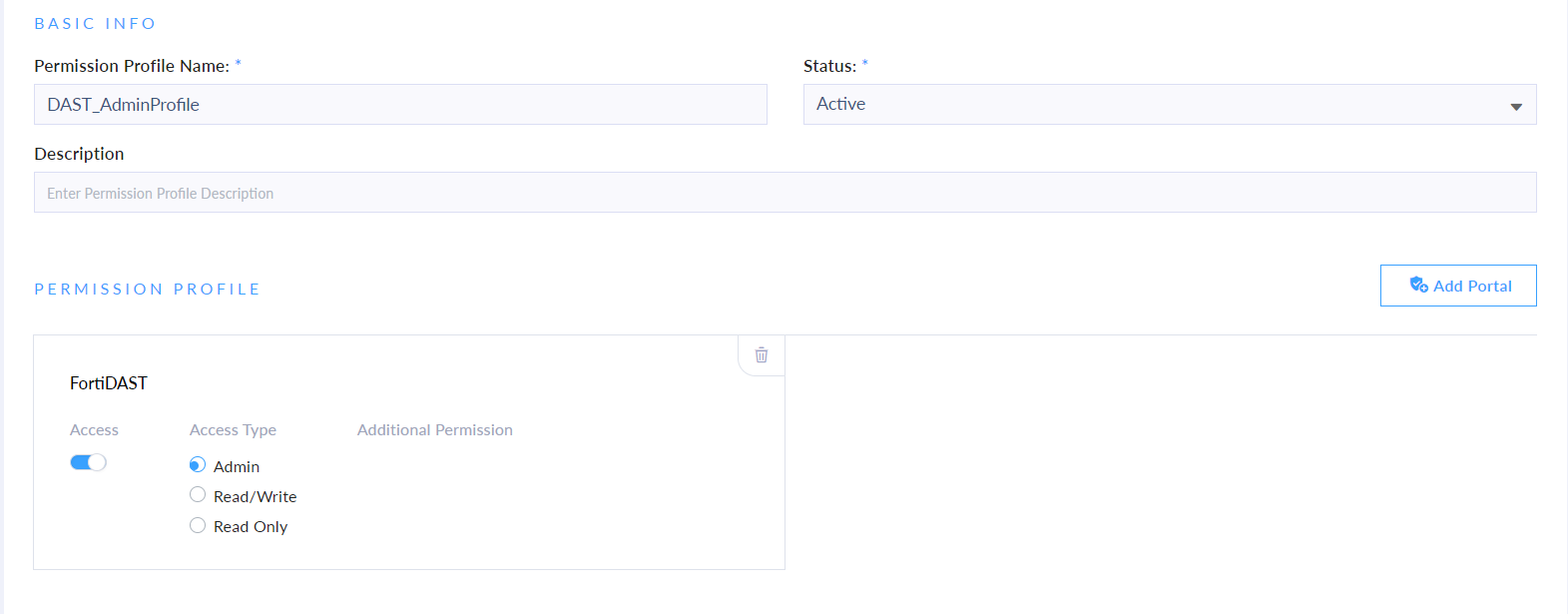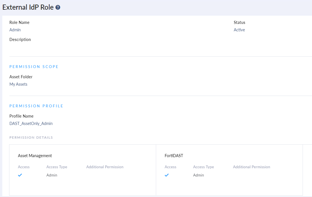 - Configure external IDP roles in FortiCloud to allow the required access to FortiDAST. See Adding External IDP Roles.