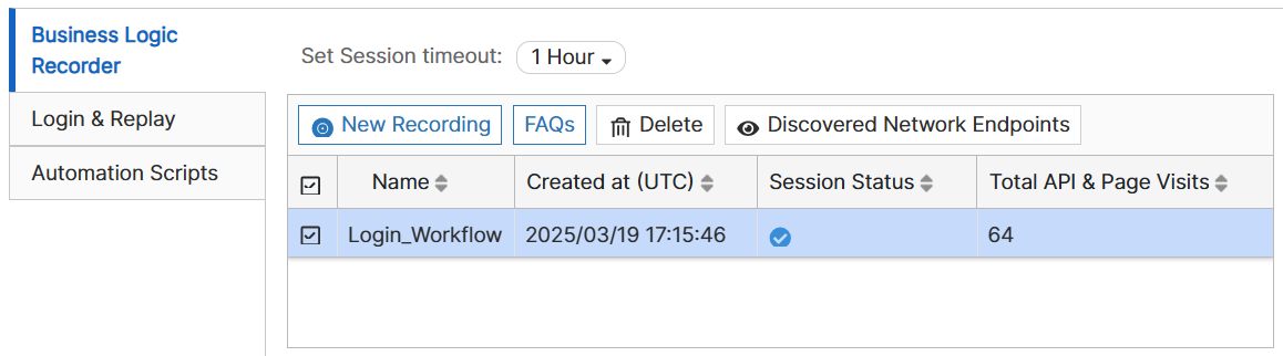 The Session Status shows if the session is valid. If expired, you are prompted to log in again when you perform scan. You can modify the session timeout at any time, and the latest timeout value updates all recordings based on the cookies or session details of the most recent recording. |