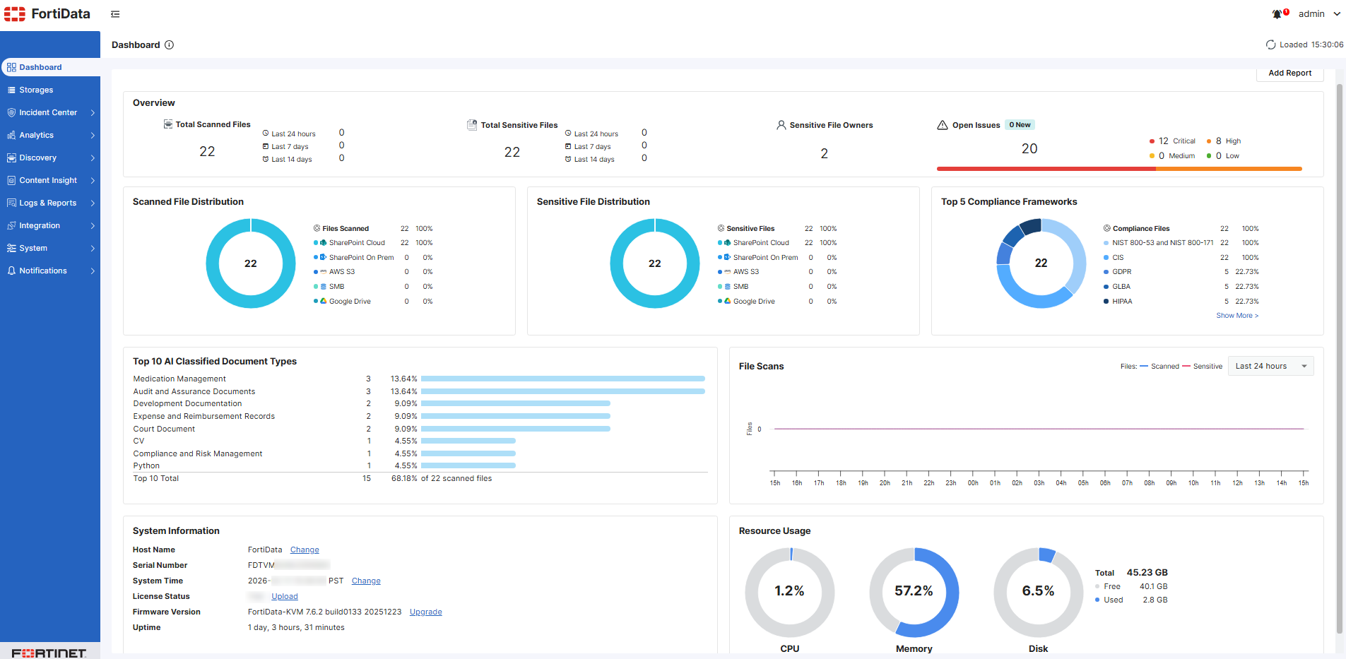 Use the Dashboard to view information of the system, such as scanned or sensitive file distribution by platform, file compliance and sensitivity information, resource usage, and system information (hostname, serial number, system time, license status, firmware version). You can also add a Risk Overview report using the Add Report button on the top-right corner. The report will then be available in the Logs & Reports > Reports page.
