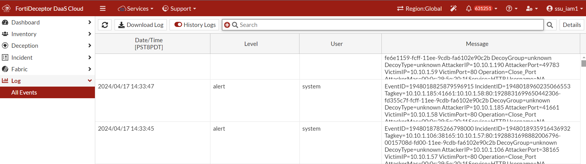 FortiDeceptor log level can be Emergency (reserved), Alert, Critical, Error, Warning, Information, or Debug. The following table provides example logs for each log level.