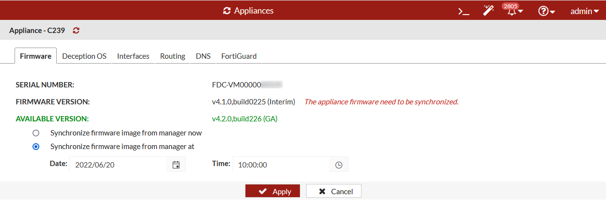 . The Appliance - <name> page displays the following tabs.Push FortiDeceptor firmware updates and upgrades to the Remote Client. Synchronization can be immediate or scheduled.