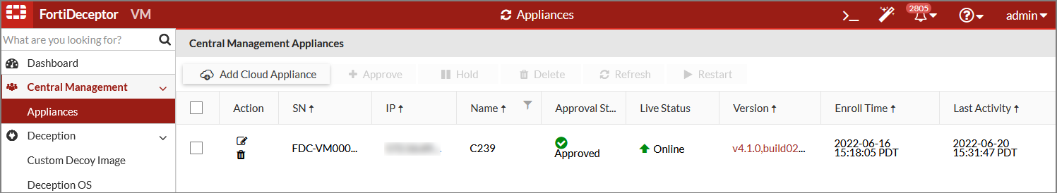 - On the Management Device, go to Central Management > Appliances. The Approval Status for the Remote Client will display On-Hold.