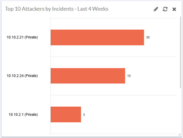 The Top 10 Attackers by Incidents widget displays the top ten attackers by the number of incidents as well as the attacker's IP address. Hover over a bar in the chart to view the number of incidents by IP.