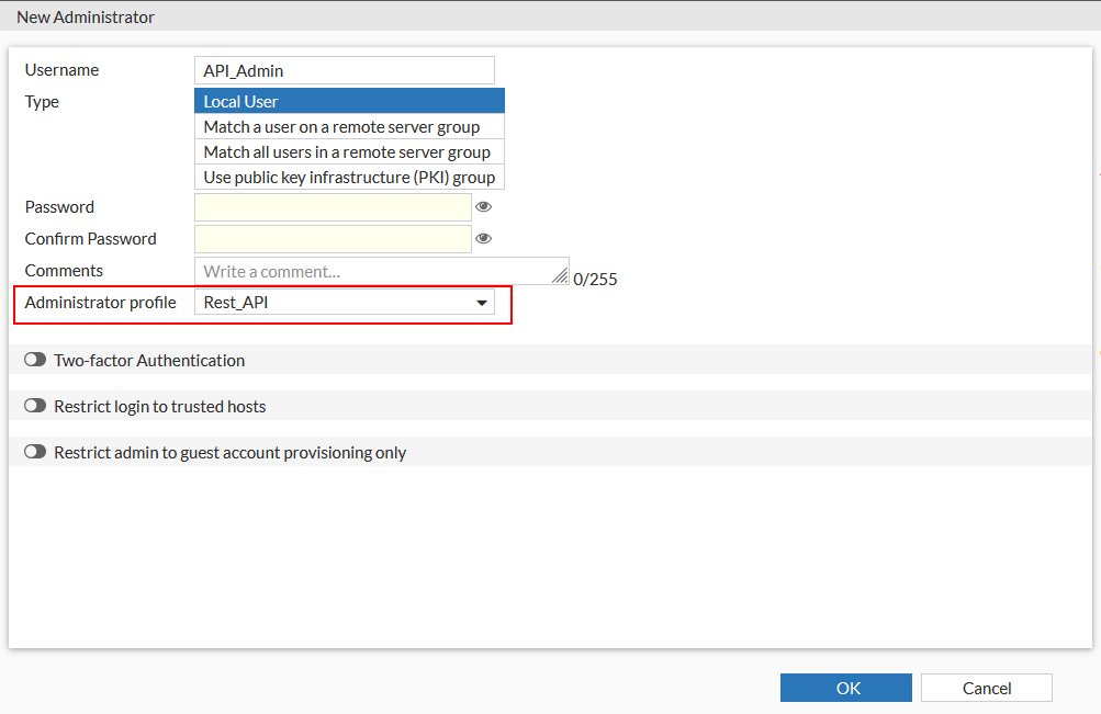 - From the Administrator profile dropdown, select the profile you created in step 1.1 Create the administrator profile in FortiGate.