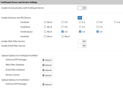 - Set Enable Communication with FortiGuard Server to OFF so that you can configure FortiManager as a local FDS server.