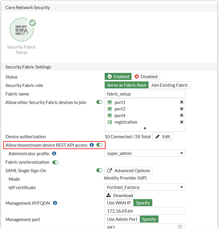 When configuring the Fabric Connector in FortiGate, you must enable Allow downstream device REST API.
