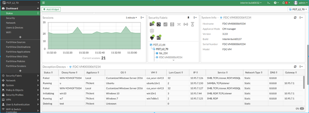 - In FortiGate, go top Dashboard > Status to view FortiDeceptor information and deception decoys configuration status.