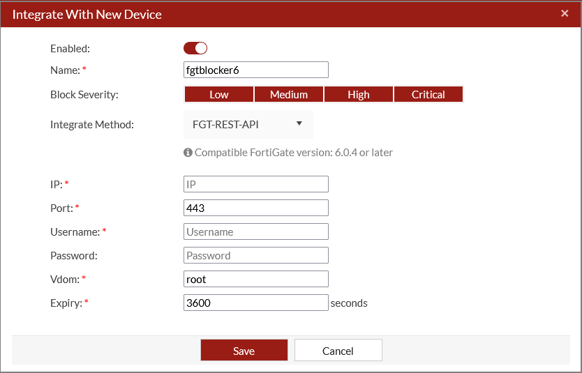 Name Enter a name for the integration. Severity Filter Select Low Risk, Medium Risk, High Risk or Critical. Integrate Method Select FGT Fabric Upstream. Upstream IP/Domain Enter the FortiGate IP address. Port Enter the FortiGate connector port. Expiry Enter the quarantine expiry time.