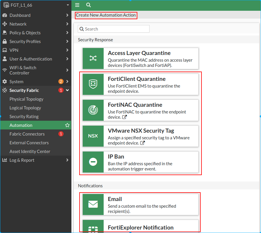 - In FortiGate, log in as an admin and go to Security Fabric > Automation.
