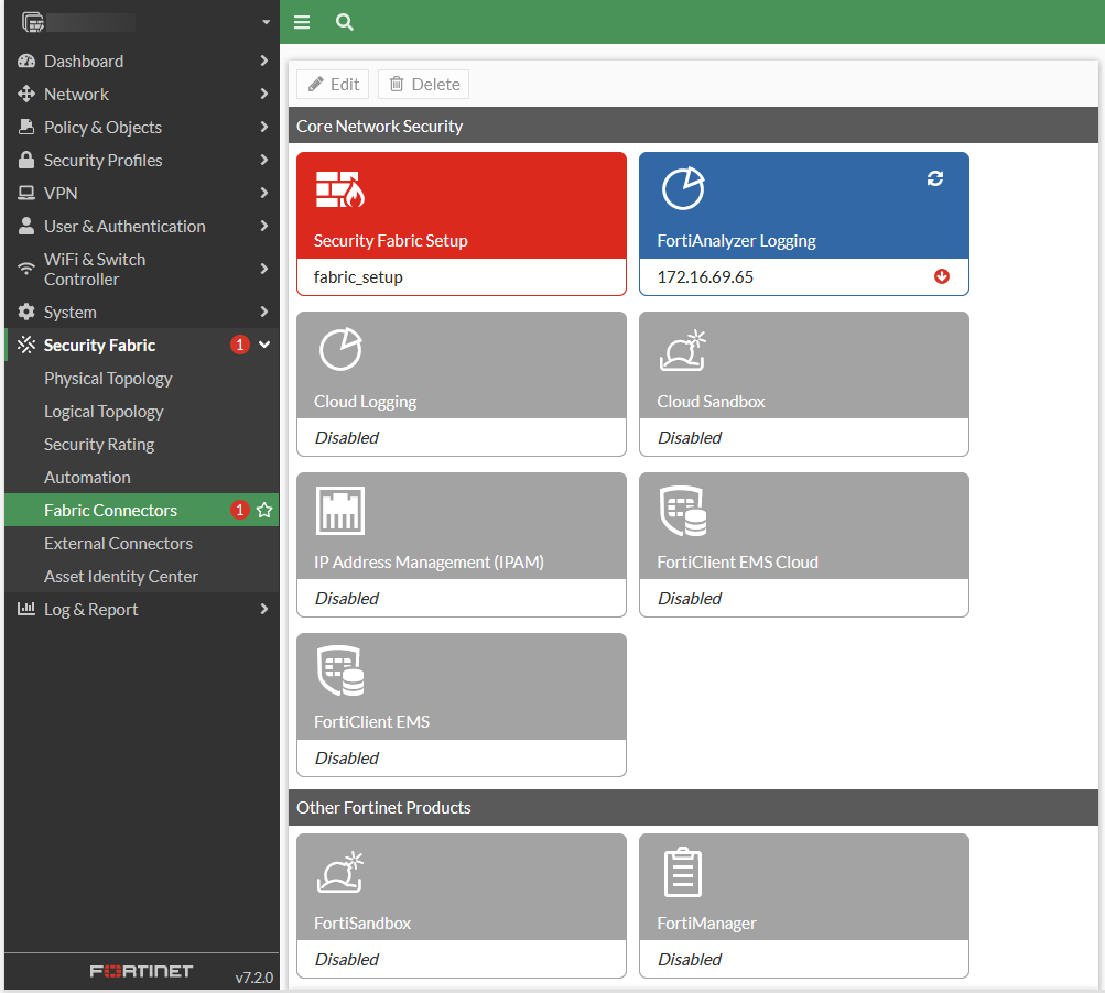 - In FortiGate, log in as an admin and go to Security Fabric > Fabric Connectors.