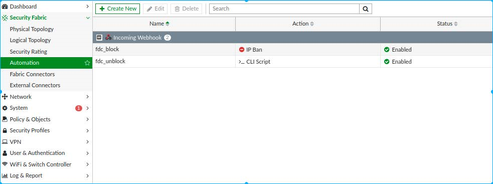 In FortiGate, go to Security Fabric > Automation and verify the Status for the block and unblock webhooks are Enabled.