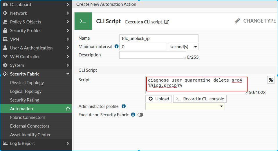 CLIand click the CLI Script tile. The Create New Automation Action opens. - Click IP Ban. Enter a Name such as