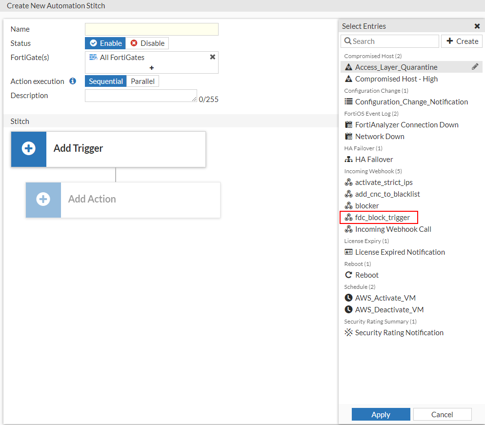 fdc_unblock_triggeryou created and click Apply. - Click Add Action. The Select Entries pane opens.