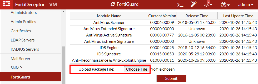 - In FortiDeceptor, go to System > FortiGuard; then beside Upload Package File, click Choose File and locate the FDS package.
