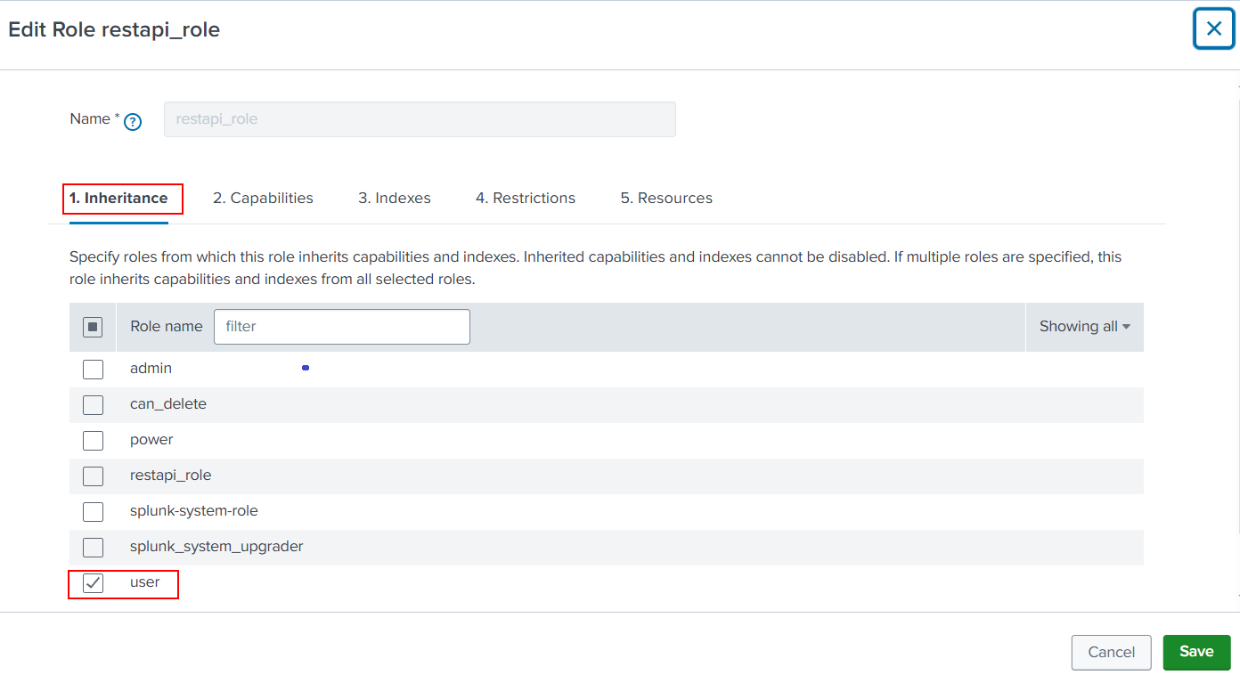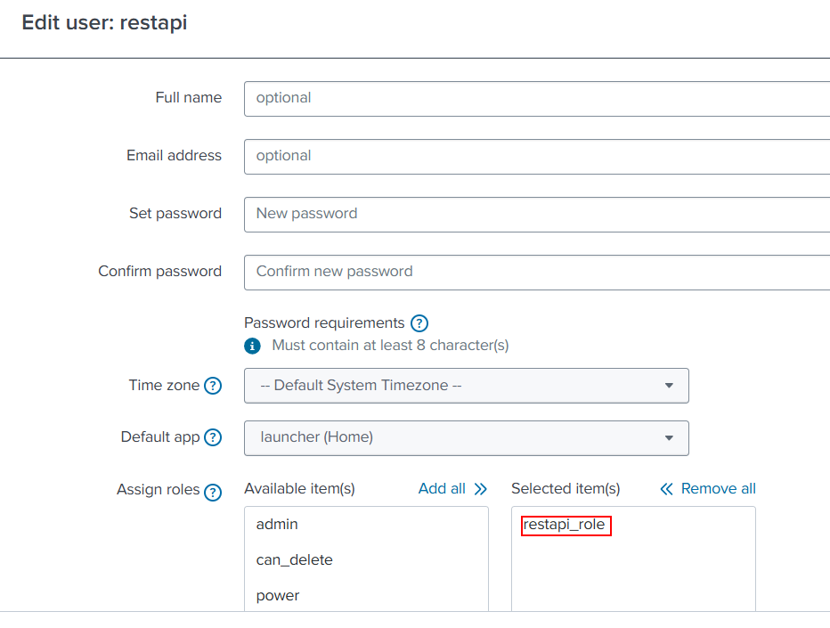 - In the Assign roles area, assign the role you created in the previous steps. In this example, restapi_role.