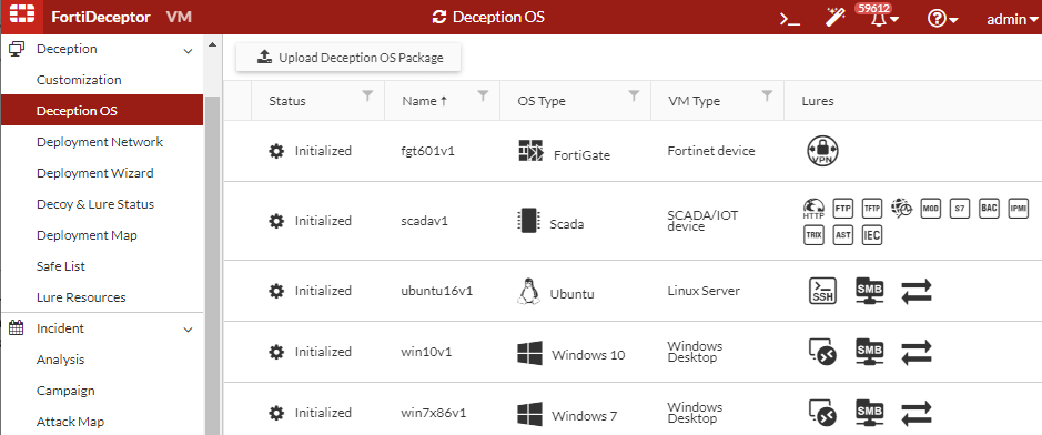 - In FortiDeceptor, go to Deception > Deception OS and click Upload Deception OS Package to import the FortiDeceptor images.