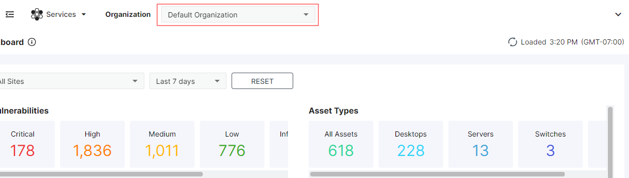 Before you assign users to a specific organization, users belong to the Default Organization. The Organization dropdown list at the top of the FortiDevice screen shows which organization is currently being displayed and allows you to switch to a different organization. The name for the Default Organization cannot be changed.