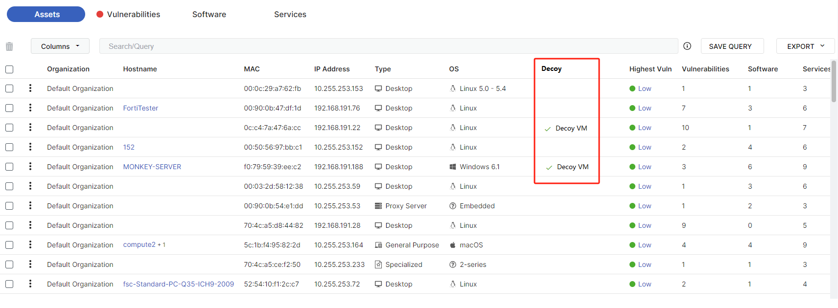 FortiDeceptor creates a network of decoy VMs to lure attackers and monitor their activities on the network. When attackers attack decoy VMs, their actions are analyzed to protect the network. Deploying FortiDeceptor devices across the entire network ensures comprehensive protection. Integrating FortiDevice with FortiDeceptor allows you to identify and show the decoy VM among the assets, so you can know how many decoy VMs and what kind of decoy VMs are deployed in the network.