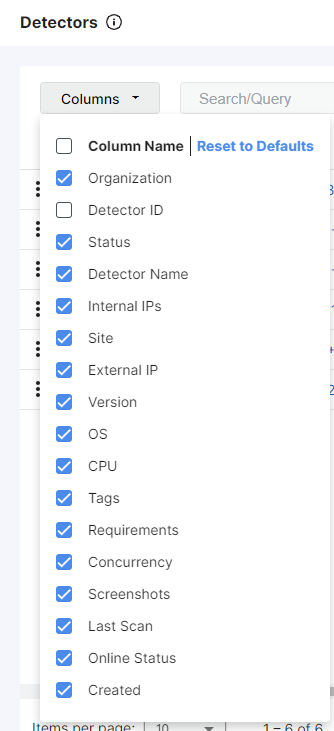 At the top of the Detectors page, you can use the Columns dropdown list to select which columns to display or to reset the columns to the default view.