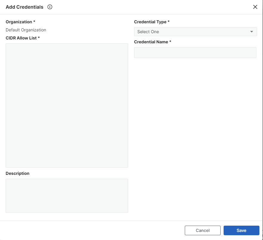 If you selected All Organizations in the Organization dropdown list at the top of the GUI, you can select which organization that the credentials will belong to.