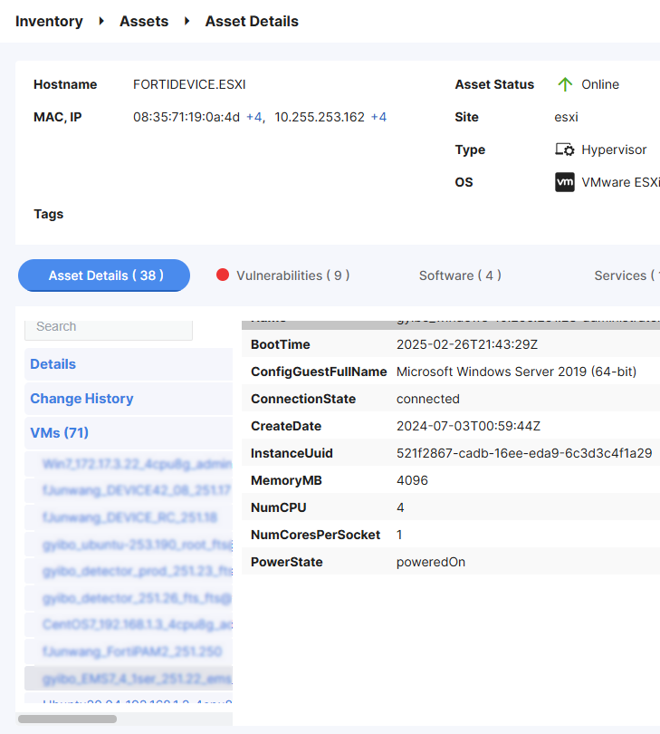 Starting in FortiDevice 25.1.b, when the asset type is a hypervisor, the Asset Details tab in the Asset Details page shows a tree view of the VMs.