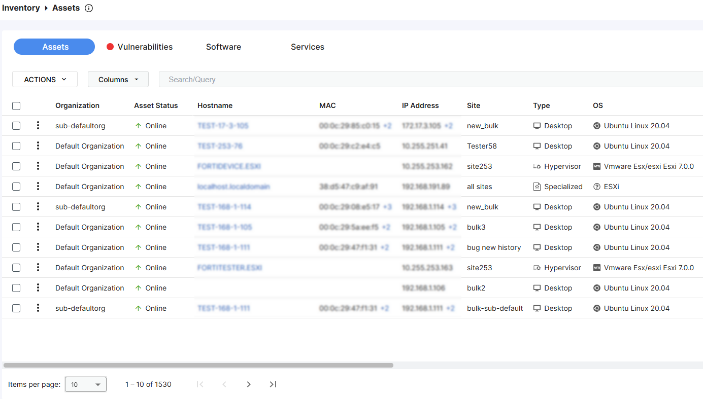 FortiDevice treats assets as unique network entities from the perspective of the system running the detector. After each scan, all assets within the corresponding site are reported in the Inventory > Assets page. Use this page to find what assets are available, which are online, and which are most vulnerable.
