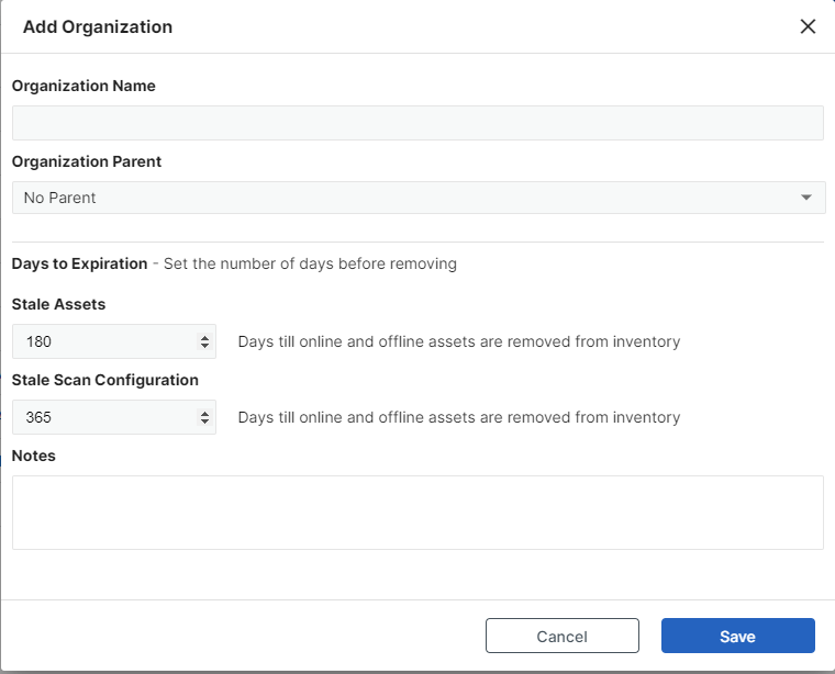 6. In the Stale Scan Configuration field, enter how many days to keep online and offline scans in the inventory for the organization.