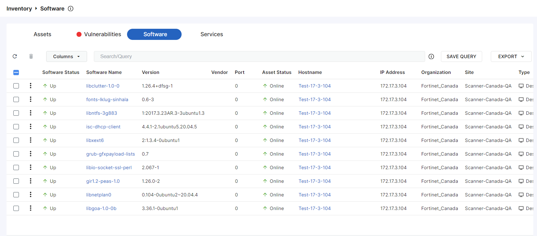 The Inventory > Software page displays one row for each software package detected by FortiDevice or a supported integration. Use this page to identify what is currently running on the host to identify ways to reduce CPU usage.