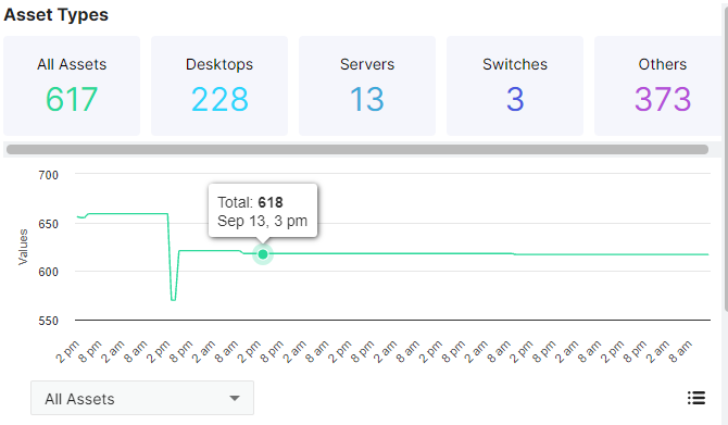 The Asset Types graph shows the number of desktop, server, switch, and other assets discovered. Hover your cursor over the Values line to see the number of that type of assets found. Use the dropdown menu to select which assets are displayed in the graph. Click the icon in the lower right to go to the Inventory > Assets page with more details about the assets found.