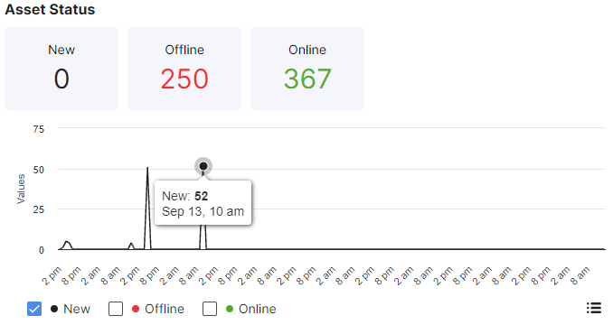 The Asset Status graph shows the number of assets that are new, offline, or online. Hover your cursor over the Values line to see the number of assets with that status for a specific date and time. Select one or more checkboxes to display the assets with that status in the graph. Click the icon in the lower right to go to the Inventory > Assets page with more details about the assets found.