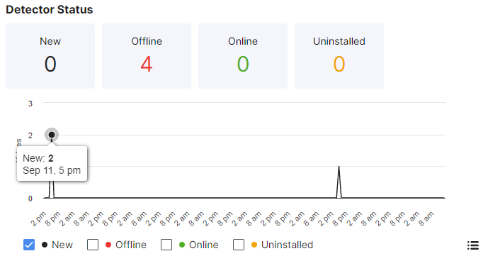 The Detector status graph shows the number of detectors that are new, offline, online, or uninstalled. Hover your cursor over the Values line to see the number of detectors with that status for a specific date and time. Select one or more checkboxes to display the detectors with that status in the graph. Click the icon in the lower right to go to the Detectors page with more details about the detectors.