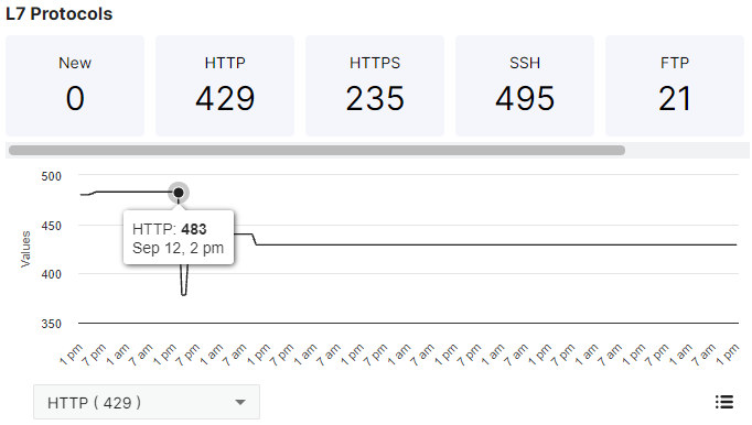 The L7 Protocols graph shows how many services were found using layer-7 protocols. Hover your cursor over the Values line to see how many services using that protocol were found. Use the dropdown menu to select which protocols are displayed in the graph. Click the icon in the lower right to go to the Inventory > Services page with more details about the services found.