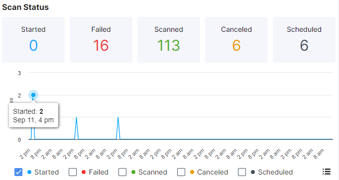 The Scan Status graph shows the number of scans currently started, failed, completed, canceled, or scheduled. Hover your cursor over the Values line to see the number of scans with that status for a specific date and time. Select one or more checkboxes to display the scans with that status in the graph. Click the icon in the lower right to go to the Scans page with more details about the scans.