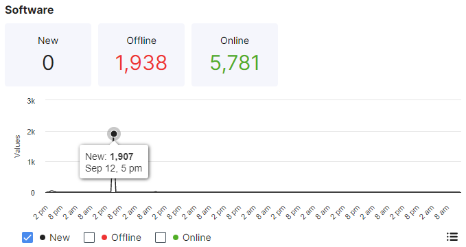 The Software graph shows the number of software programs that are new, offline, or online. Hover your cursor over the Values line to see the number of software programs with that status for a specific date and time. Select one or more checkboxes to display the software programs with that status in the graph. Click the icon in the lower right to go to the Inventory > Software page with more details about the software programs found.