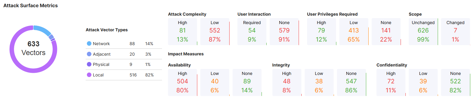 The Attack Surface Metrics widget shows the number of attack vectors, attack vector types, attack complexity, whether user interaction or user privileges are required, the scope of the attack, the availability of impact measures, integrity, and confidentiality.