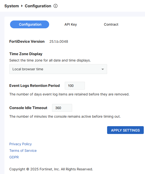 In the Configuration page, you can see the FortiDevice version, change the time zone, set how long event log entries are kept, set how long the console remains active, and view the privacy policy, terms of service, and GDPR.